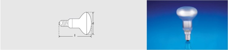 | R50 | V | W | Provedení | Svítivost (cd) | Životnost (h) | Patice | Rozměry (mm) |